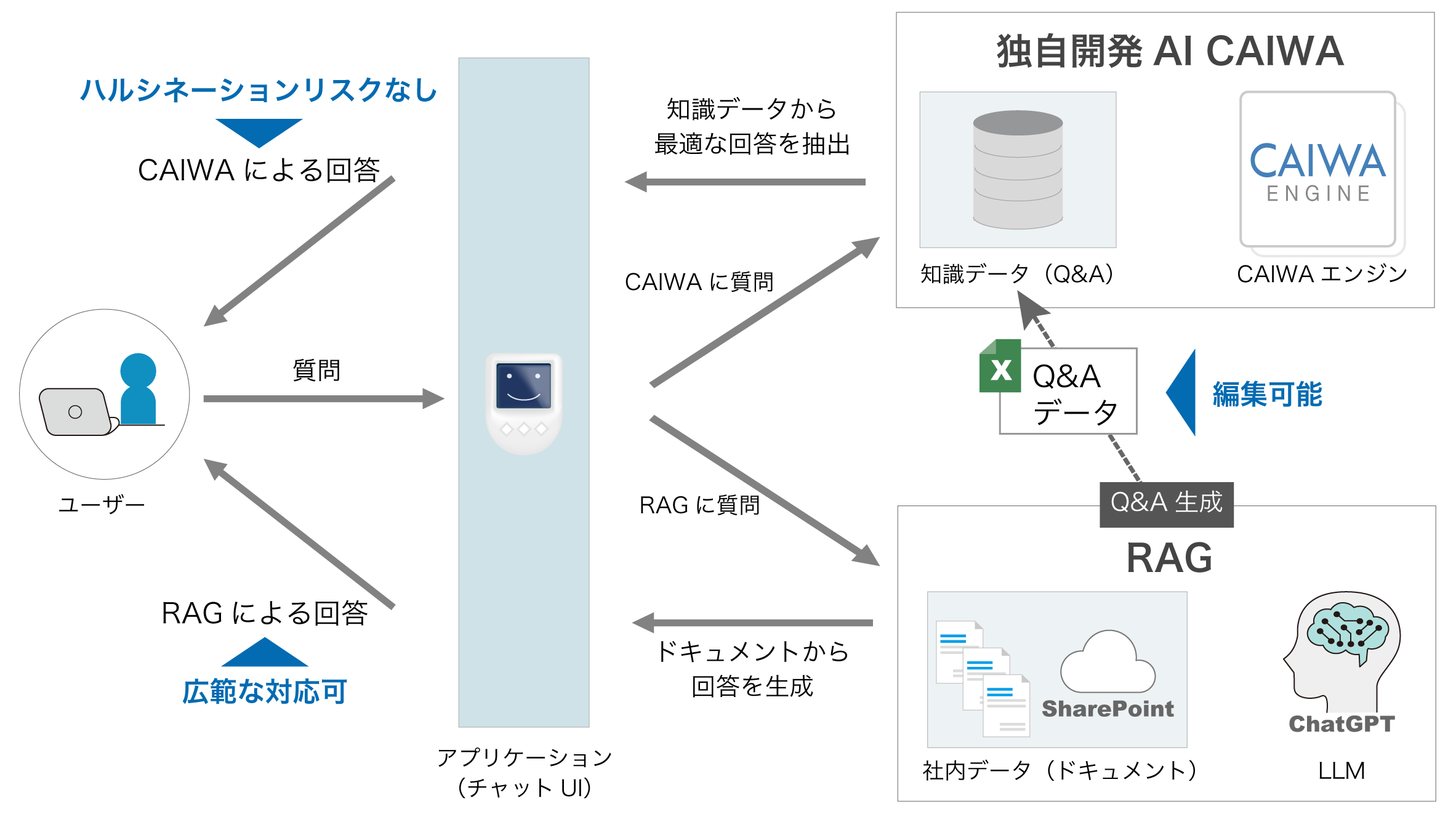 前章の図2をご覧いただくと、アプリケーションへの回答には2つのルートがあることがわかります。1つめは独自開発AIのCAIWAから抽出される回答(知識データから最適な回答を抽出)、2つめはRAGから生成される回答(ドキュメントから回答を生成)の2つのルートです。