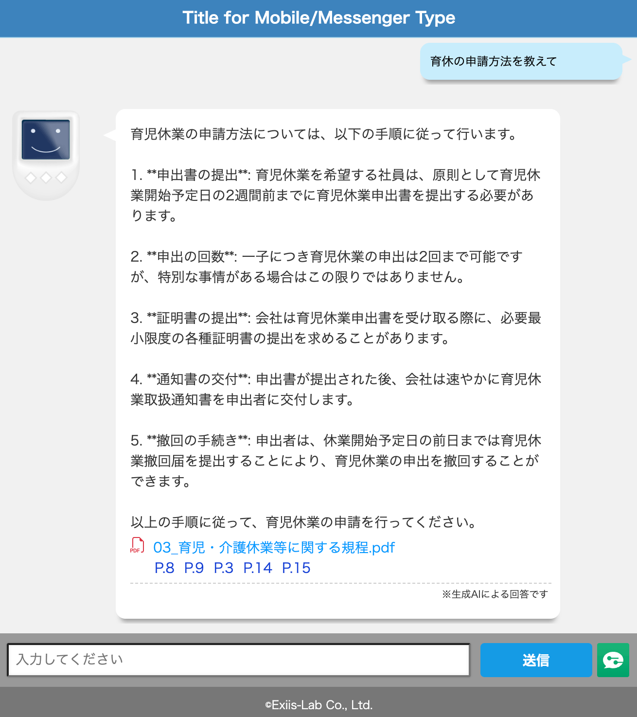 CAIWA Service ViiiのAIチャットボットでChatGPTを使った場合には、回答の元となったドキュメント(生成元ファイル)が表示されます。たとえば図4の場合は、ユーザーからの質問に対して「03_育児・介護休業に関する規程.pdf」の内容を元にChatGPTが回答を生成していますが、回答に疑問がある場合やさらに詳細に知りたい場合などには、簡単に生成元ファイルを参照しファクトチェックができます。