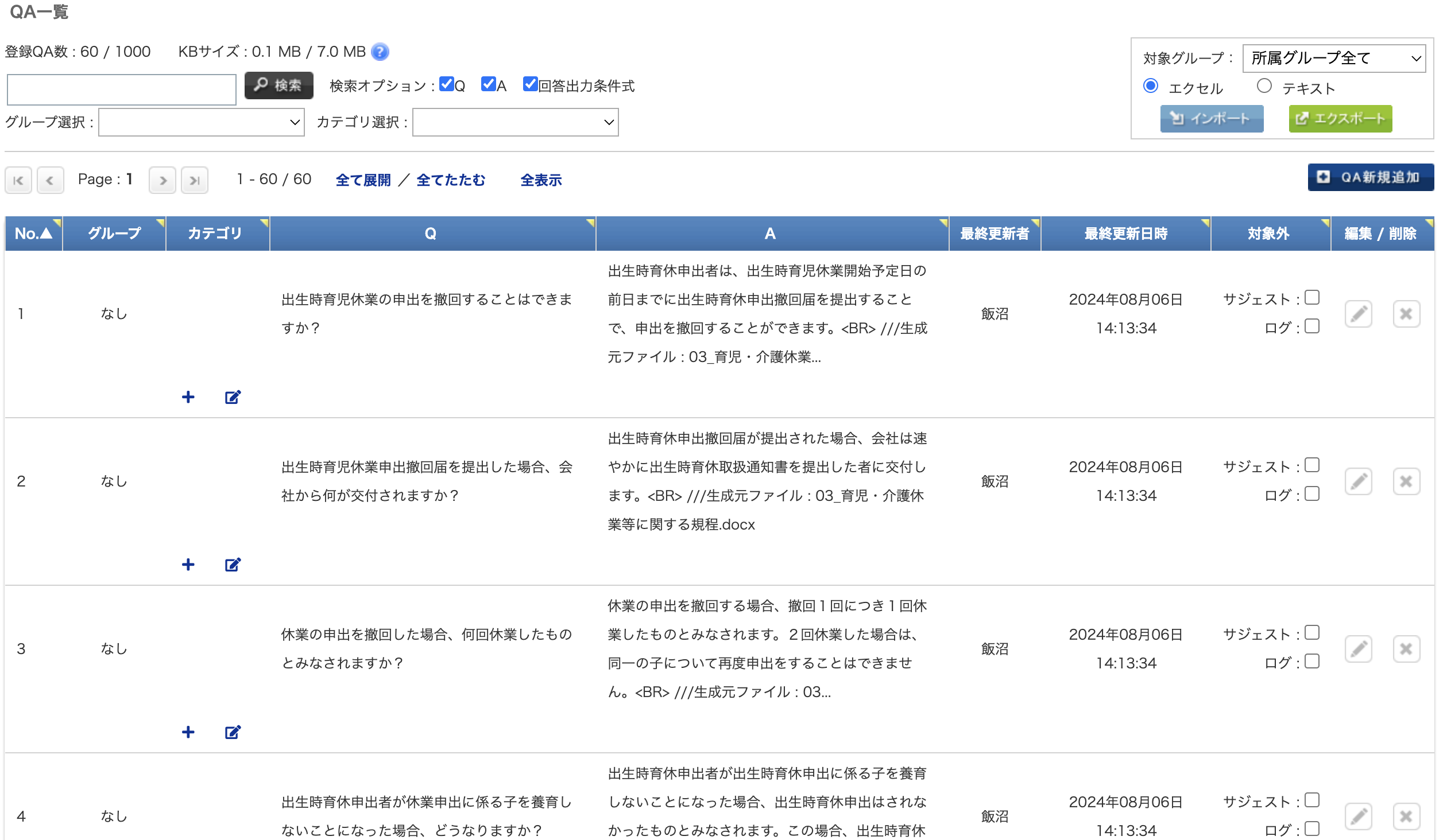 また、このQ&AはCAIWA ROBOT MANAGERから編集することもできるので、万が一間違った内容や適切でない質問が生成されていた場合、この画面で質問や回答を修正・削除し再出力できます。また先述のようにRAGから出力するQ&Aはエクセルのファイル形式で生成されるので、CAIWA ROBOT MANAGERにログインできない別部署の方に回答内容をチェック・編集してもらうことも可能です。ChatGPTからの回答は編集できませんが、CAIWAでのQ&Aであればメンテナンスも簡単に行えます。