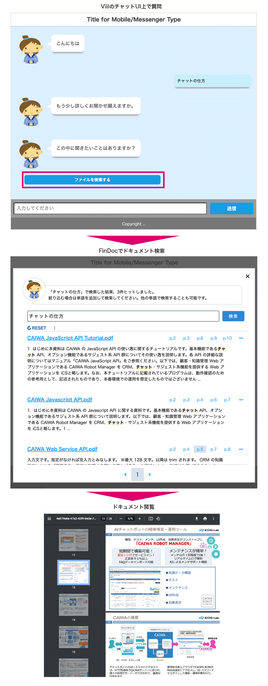 製品情報ViiiとFinDocを連携することで、Viiiで問題が解決しなかった場合などに、FinDocをViiiの画面から立ち上げて、社内の電子文書を全文検索することが可能になります。質問に関連した情報が、ヒットしたドキュメントのどのページにあるかまでわかるため、チャットボットに設定された知識データだけではなく、社内文書からも情報を得られるため、問題解決率が向上します。